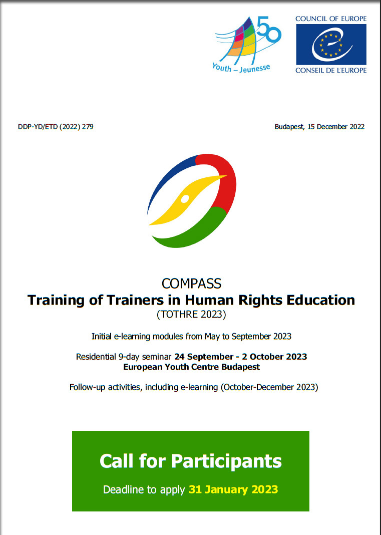 Uluslararası Organizasyonlar ve Dış İlişkiler Genel Müdürlüğü'nün İlgi'de kayıtlı yazısı ile, Avrupa Konseyi İnsan Hakları Eğitimde Eğiticilerin Eğitimi Programı'nın Çevrimiçi Öğrenme (Mayıs-Eylül 2023), Avrupa Gençlik Merkezinde 9 Günlük Yatılı Eğitim Semineri (24 Eylül – 2 Ekim 2023/ Budapeşte) ve ilk iki aşama sonrası İzleme Aktiviteleri (Ekim-Aralık 2023) olmak üzere üç aşamada gerçekleştirileceği ve söz konusu Eğitim Programına ilişkin hazırlanan özet bilgi notu ve Avrupa Konseyi Gençlik departmanından alınan ayrıntılı çağrı metni Ek'te yer almakta olup, anılan Eğitim Programına 18-30 yaş arası akıcı İngilizce bilgisine sahip özellikle gençlik çalışması faaliyetlerinde bulunan ve insan hakları eğitimi ile ilgili kurum ve kuruluşlarda faaliyet gösteren eğitimcilerin ve gönüllülerin 31 Ocak 2023 tarihine kadar http://youthapplications.coe.int adresinden çevrimiçi olarak başvuruda bulunması beklendiği anlaşılmaktadır. Ayrıca ilgili çağrı metninde daha fazla bilgi için eyc.programme@coe.int e-posta adresi ile iletişime geçilebileceği bildirilmiştir. Avrupa Konseyi üyesi ülkelerden 35 kişinin belirlenen kriterlere göre dengeli seçileceği ve 60 Euro kayıt ücreti ile söz konusu Eğitim Programının uygun bulunması halinde gerçekleşeceği ilgi yazı ile bildirilmiştir.